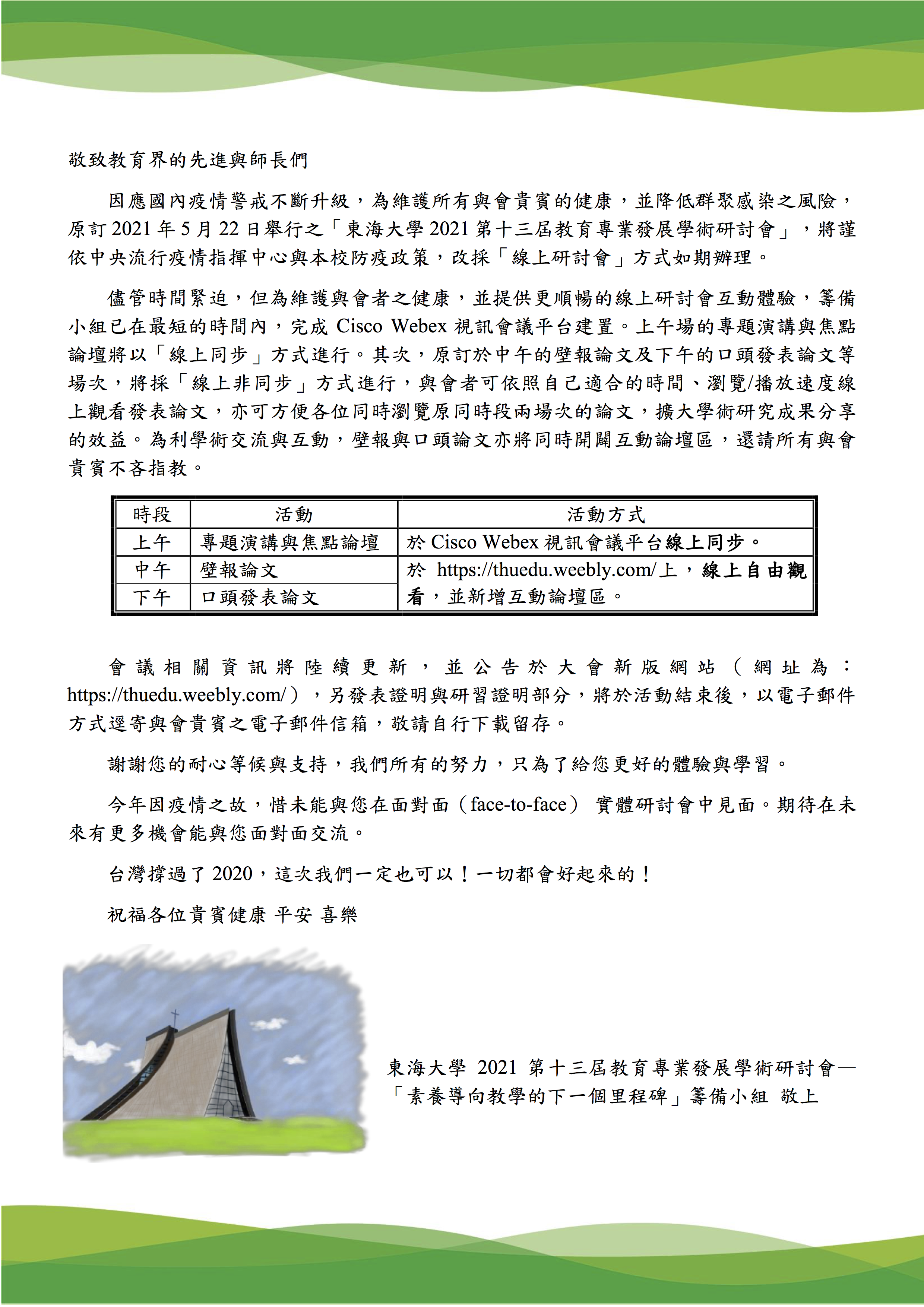 因應國內疫情警戒不斷升級,為維護所有與會貴賓的健康,並降低群聚感染之風險,原訂2021年5月22日舉行之「東海大學2021第十三屆教育專業發展學術研討會」,將謹依中央流行疫情指揮中心與本校防疫政策,改採「線上研討會」方式如期辦理。