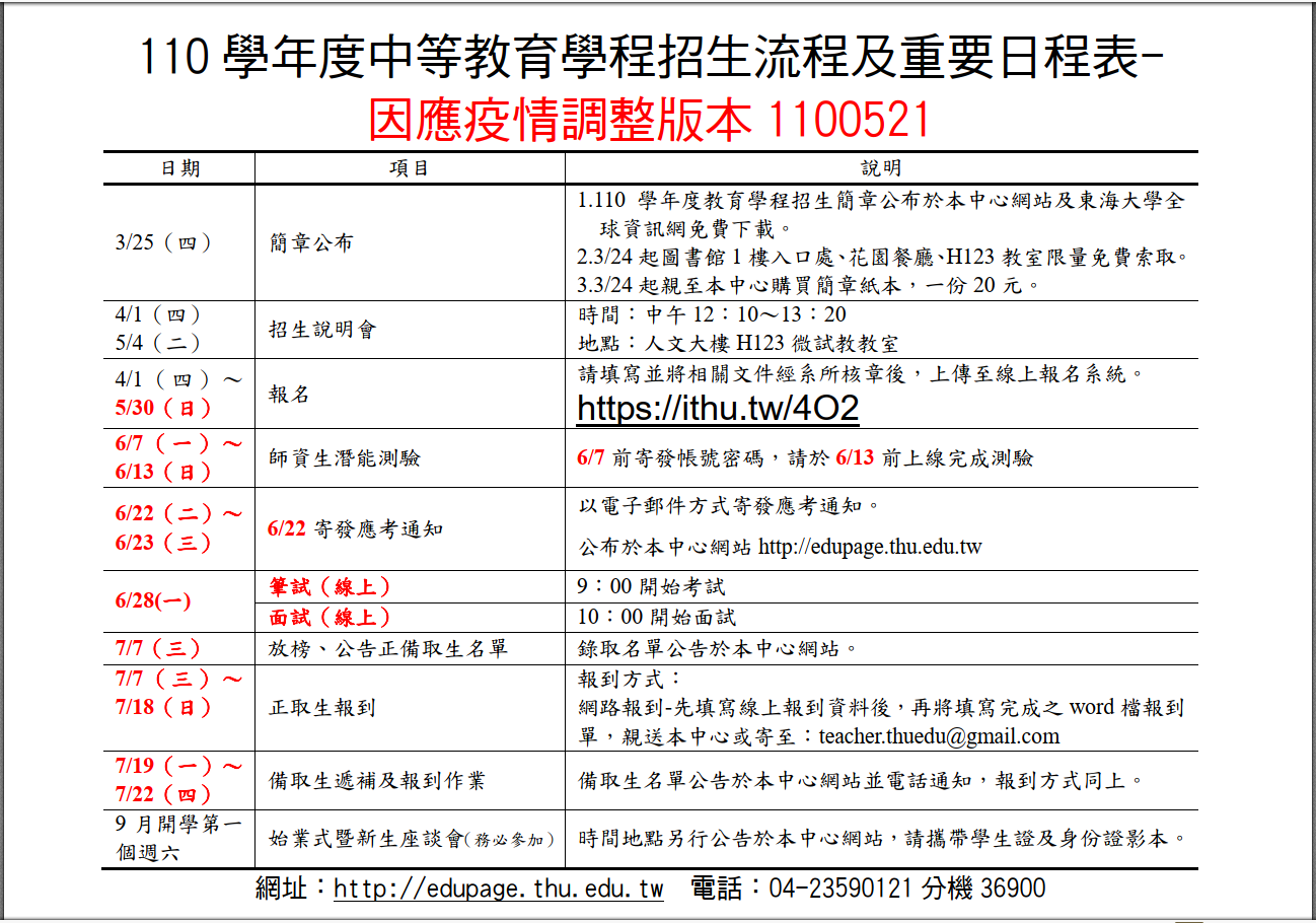 【重要】東海師培110學年度中等教育學生招生日程調整-報名延後至5/30