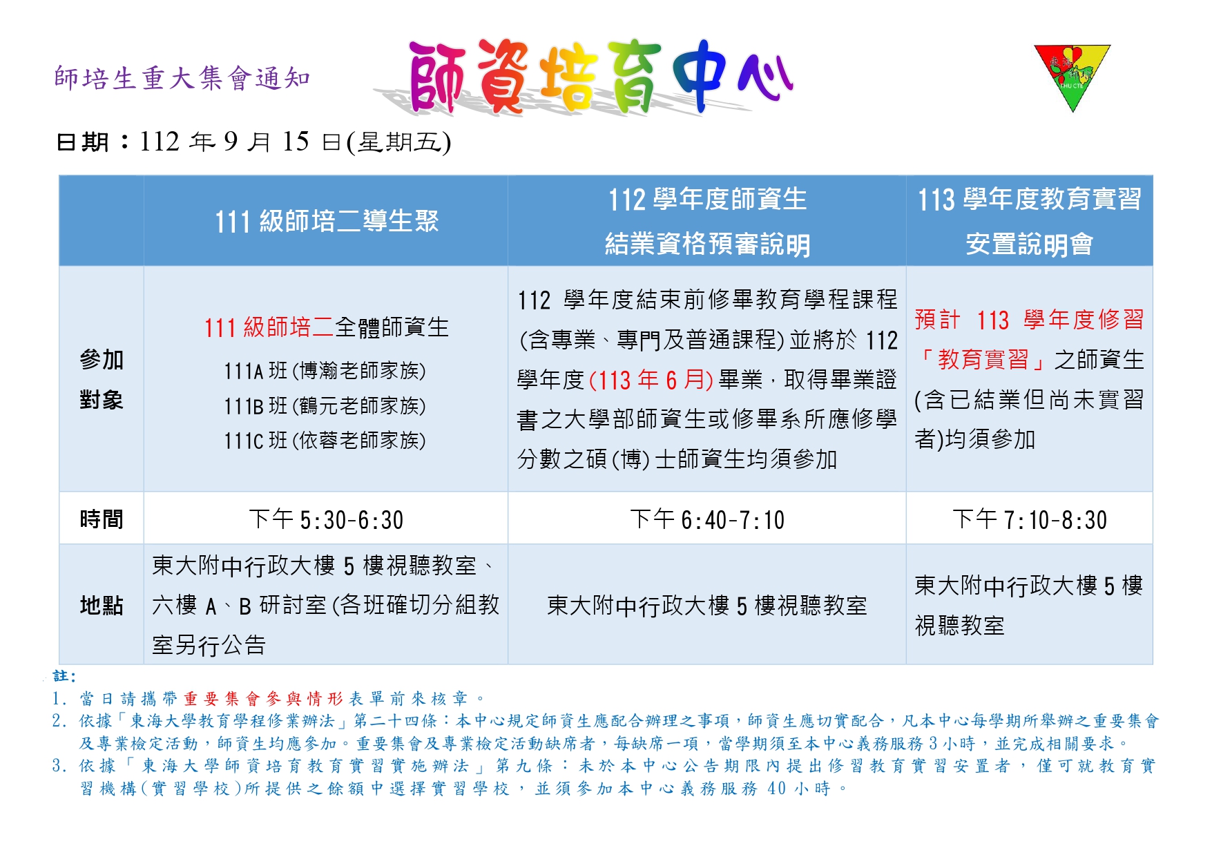 112學年度師資生重大集會通知